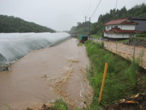 三年前の西日本豪雨災害では、ビニールハウスに周辺の山々から大量の土砂が流れ込み