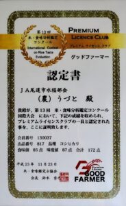 高得点を取り「プレミアム・ライスネス・ベストファーマー」の称号をいただいてます。